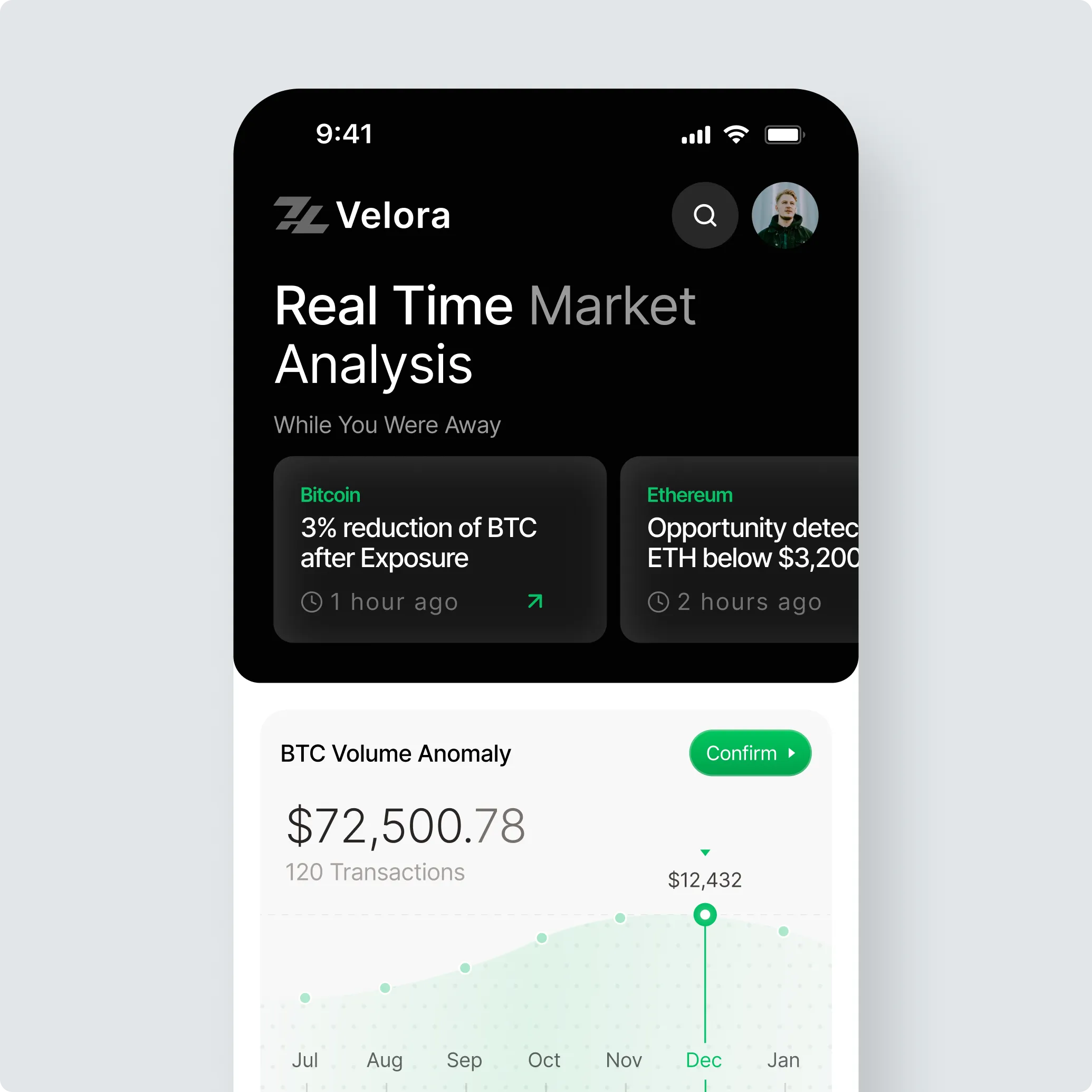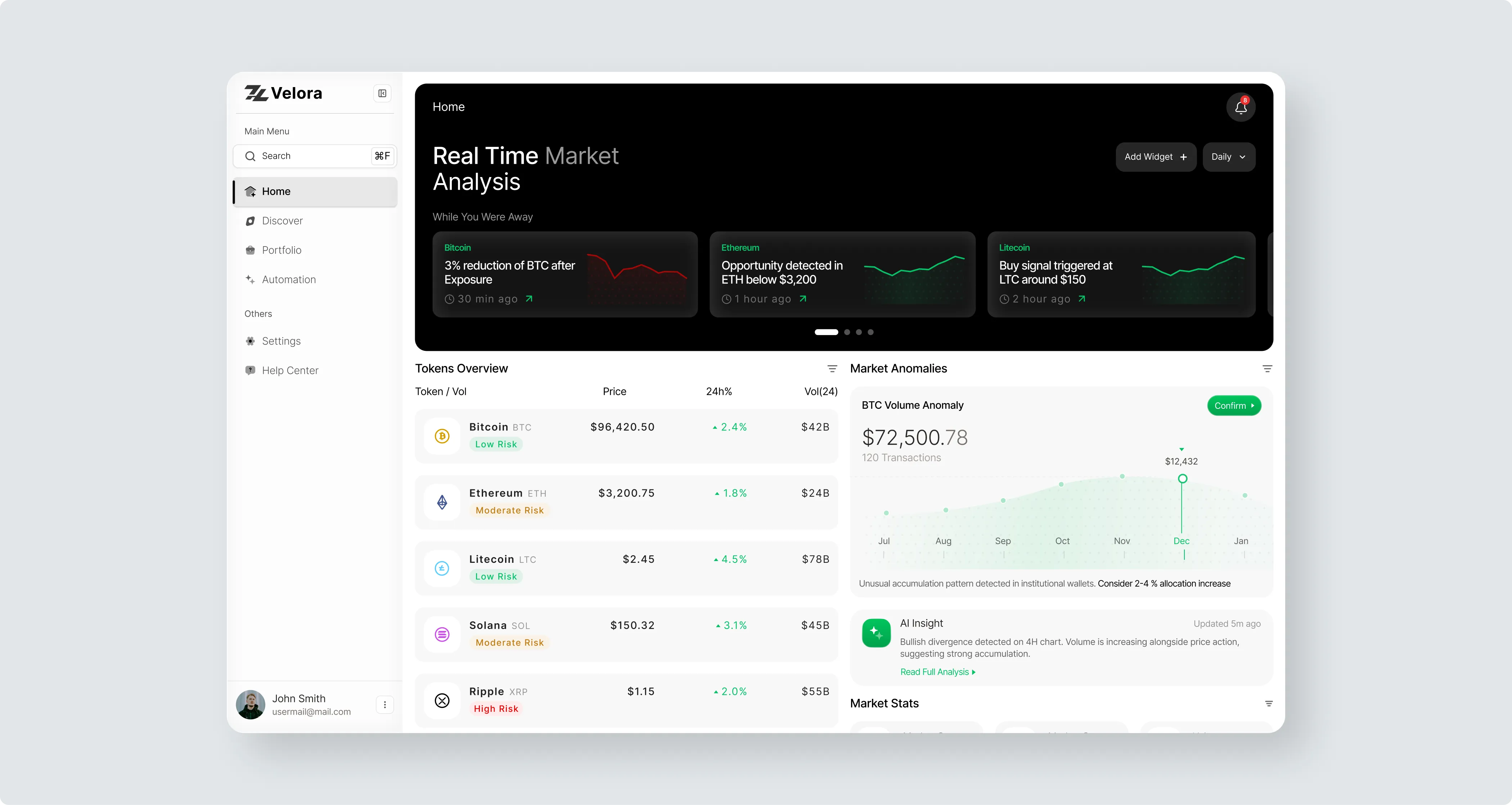 Velora identified an opportunity to move the crypto experience from reactive data overload to proactive, intelligent automation. We supported end-to-end: strategic consulting, branding, UX/UI design, and development for a web platform and mobile app, creating a scalable SaaS ecosystem with a persistent AI agent that handles complex analysis and automated execution.