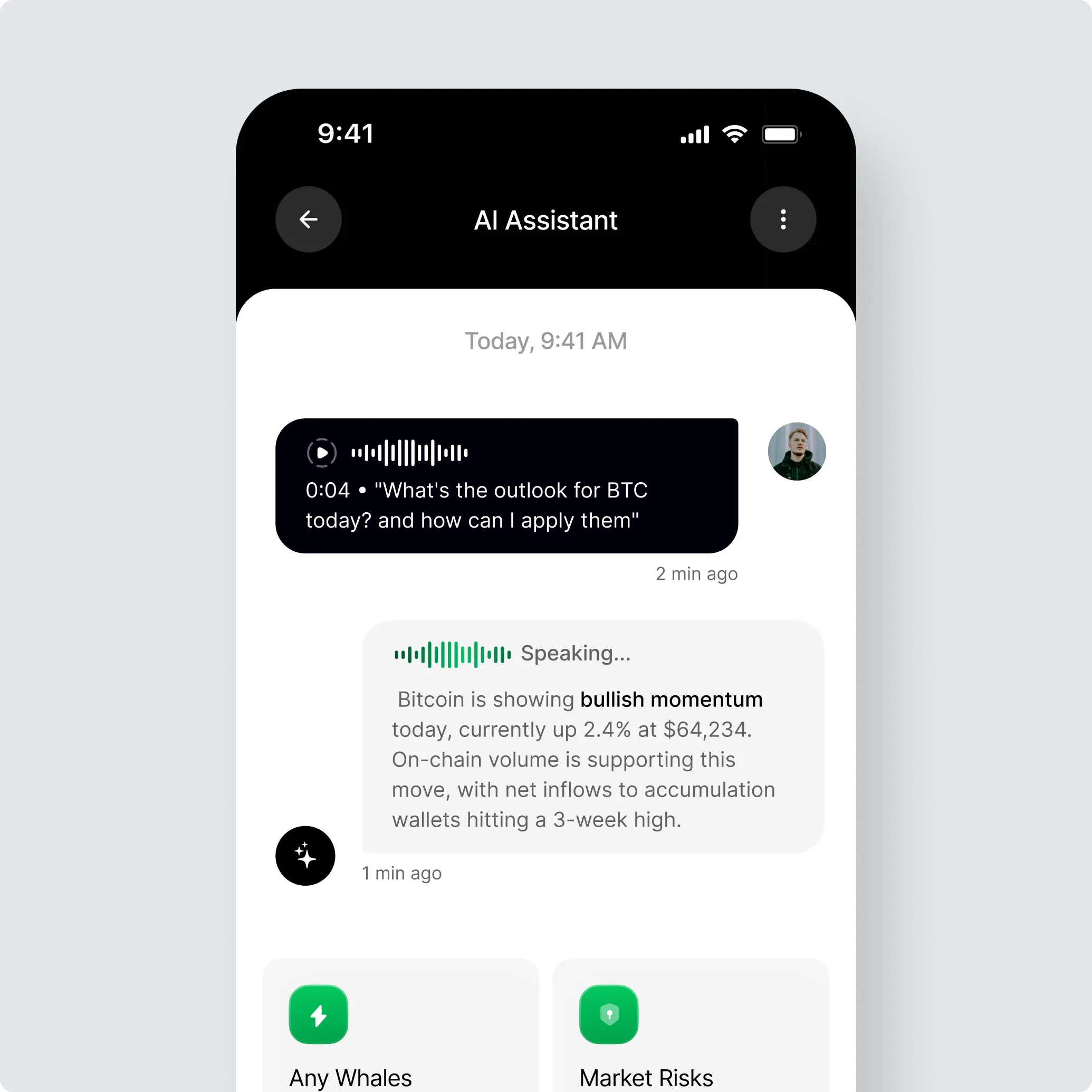 Objective: Turn passive insights into active guidance and automated execution. We prototyped the core agent behaviors: health scoring for tokens, risk surfacing (e.g., whale movements), personalized recommendations, and natural language summaries of market activity. We validated that the agent reduces manual analysis and accelerates decisions, with flows for setting automated rules ("if X happens, do Y") and confirming high-stakes actions before execution.