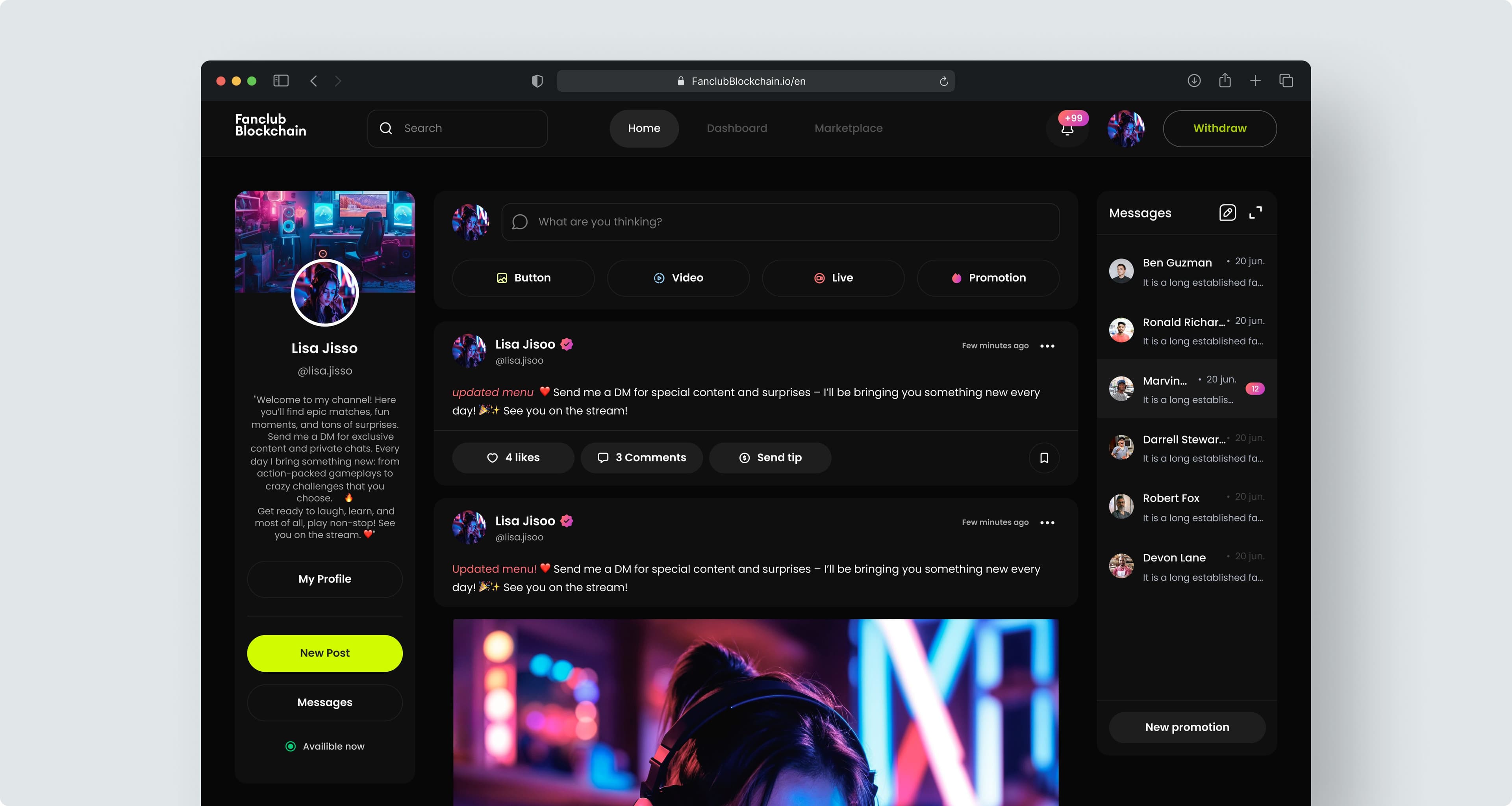 3. Web and Mobile Application: A cross-platform solution (web and mobile) was developed to ensure secure interaction between creators and fans. With an intuitive UX, accessible interfaces, and blockchain technology to protect content, a comprehensive solution was delivered that meets technological standards and community expectations.