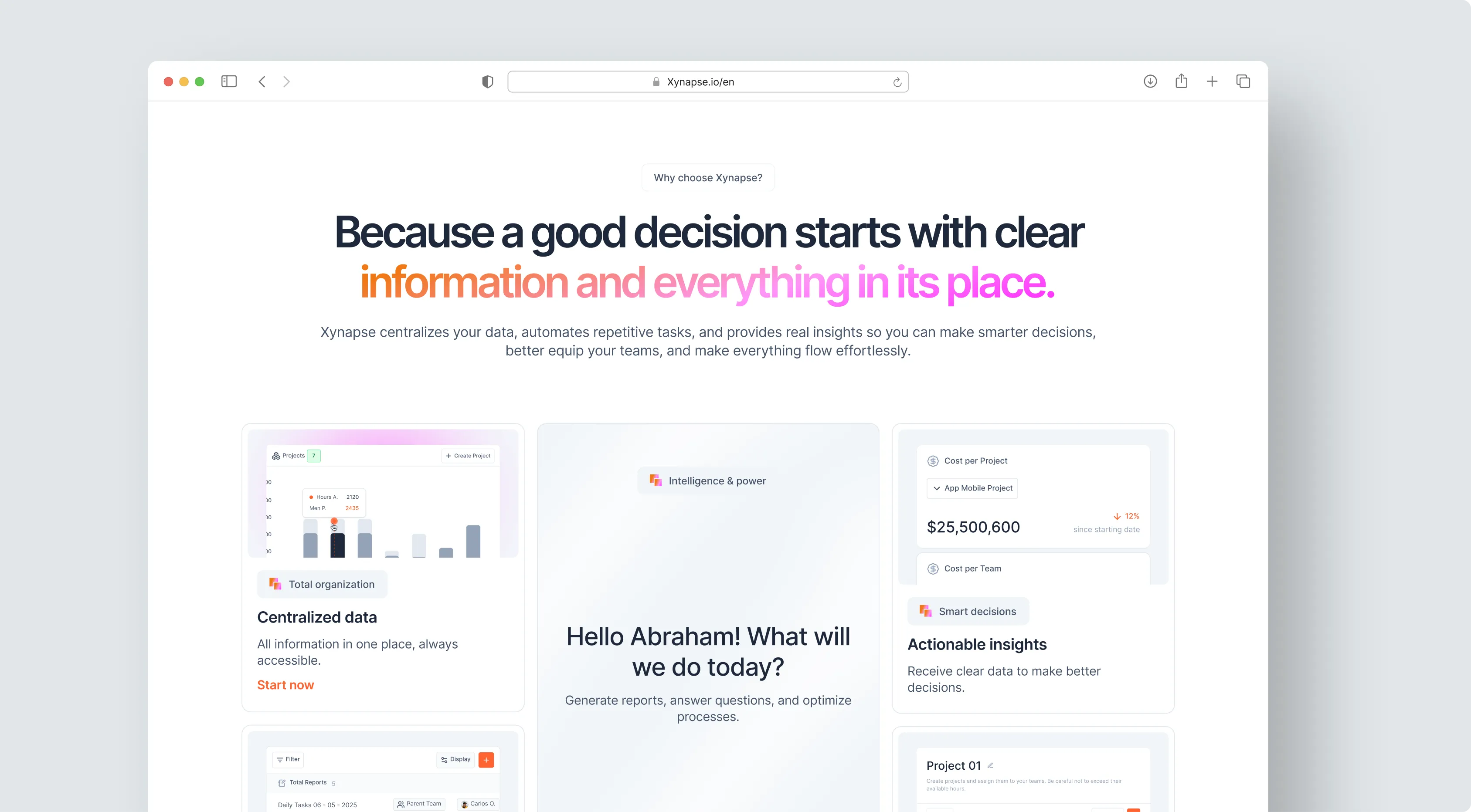 At MeetLabs, we helped Xynapse transform the management of teams, projects, and costs through artificial intelligence. We created a centralized and intuitive platform, optimizing every area from finance to logistics and enabling automated decision-making. Today, Xynapse is more than just a Business Intelligence tool: it is the digital co-pilot of business efficiency, ready to scale and integrate new capabilities.